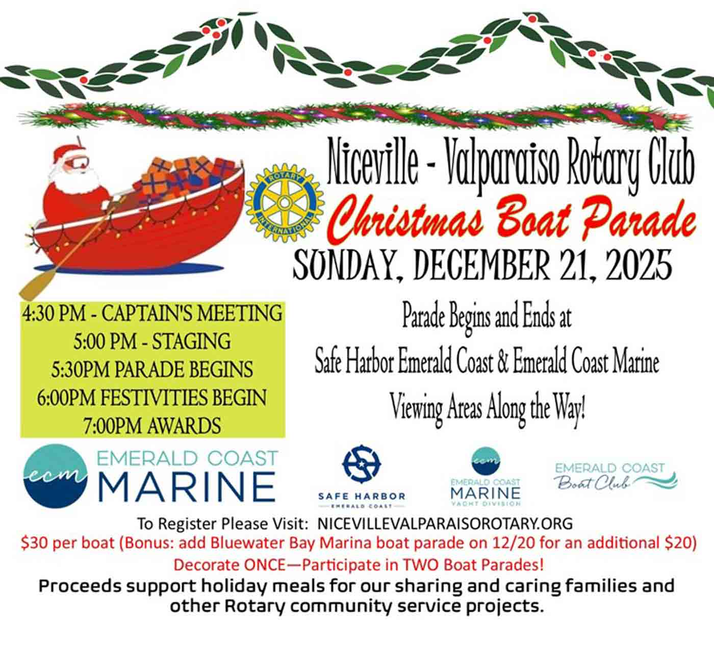 The Niceville–Valparaiso Rotary Club will host its 2025 Christmas Boat Parade on December 21, 2025. (Contributed)