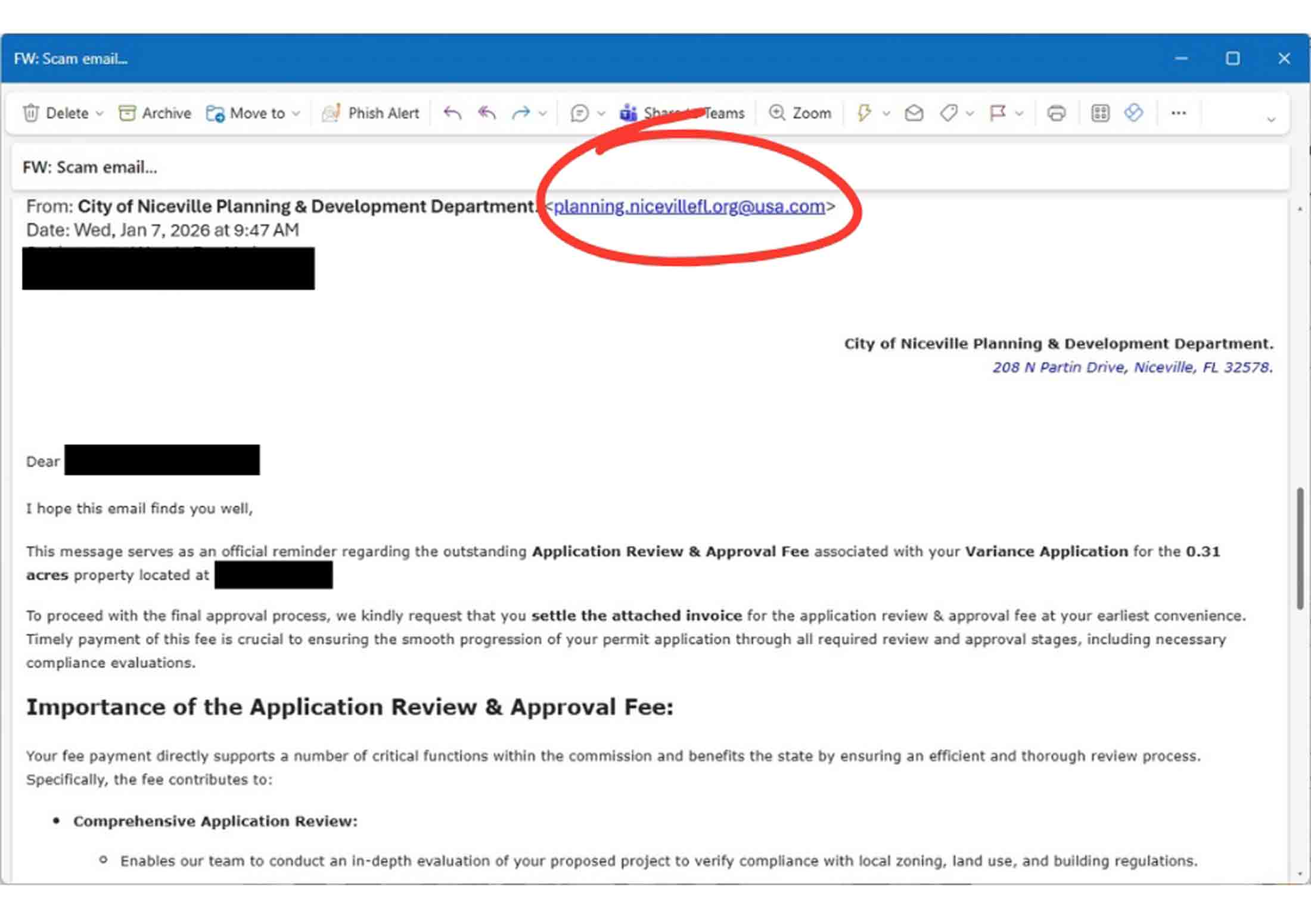 According to the City of Niceville, the email appeared to come from the Planning and Development Department and included the name of an actual department contact, but originated from an unofficial email domain.