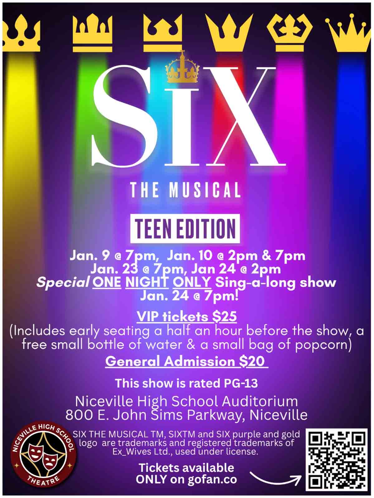 NICEVILLE, Fla. — The Niceville High School Theatre Department will present the musical “Six: Teen Edition” on January 9, 10, 23, and 24 at the Niceville High School Auditorium.