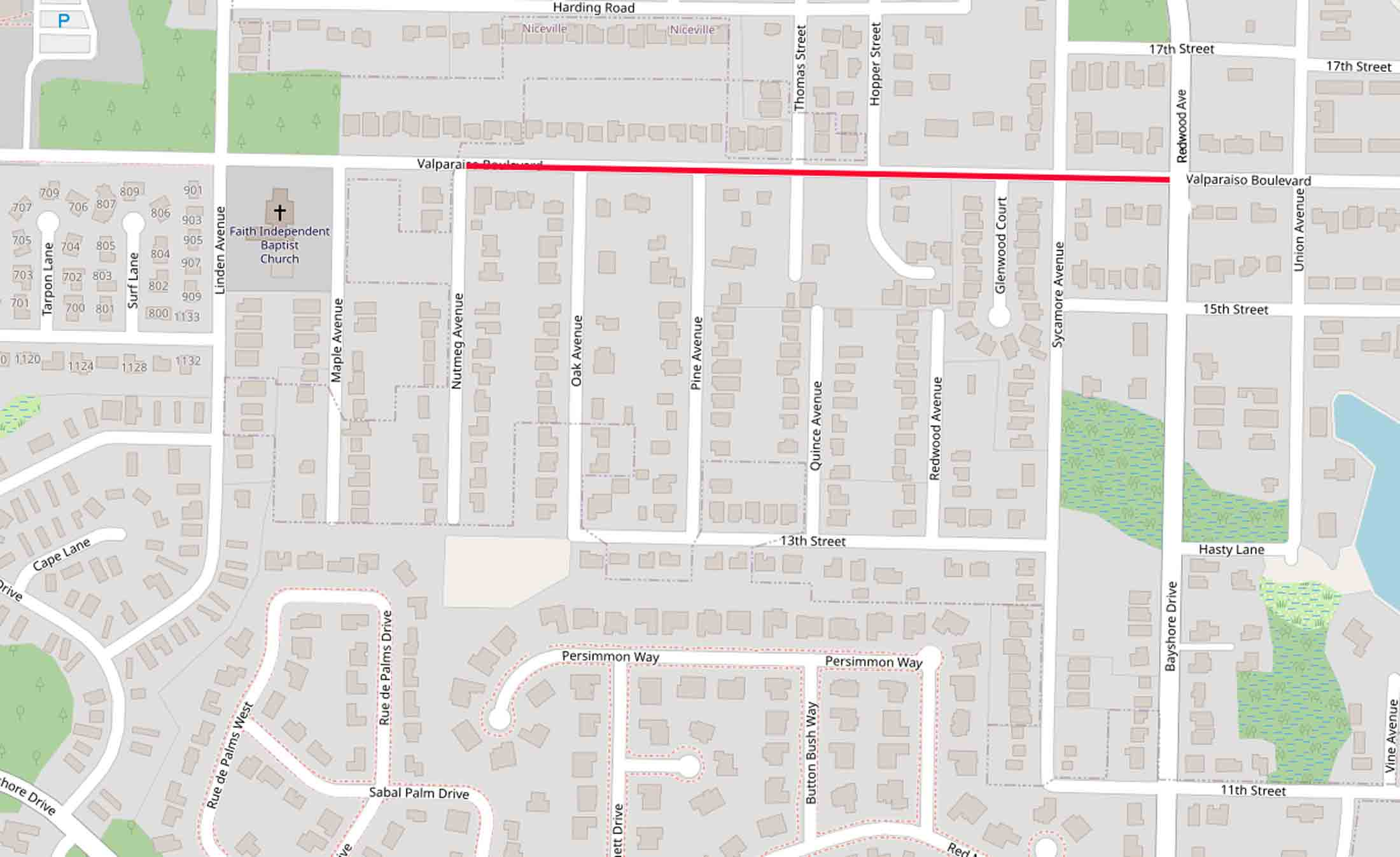 Map showing planned sidewalk construction along Valparaiso Boulevard between Nutmeg Avenue and Redwood Avenue in Niceville.