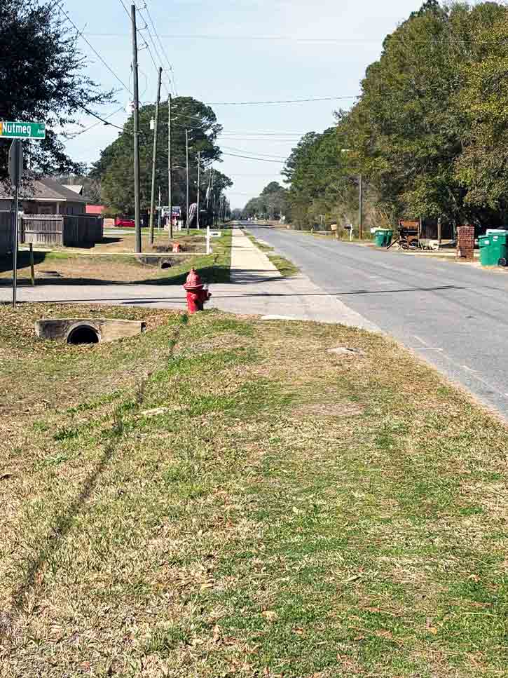 The existing sidewalk along Valparaiso Boulevard ends near Nutmeg Avenue, where a new sidewalk segment is planned to extend east toward Redwood Avenue. (Niceville.com/Dennis Gilson)