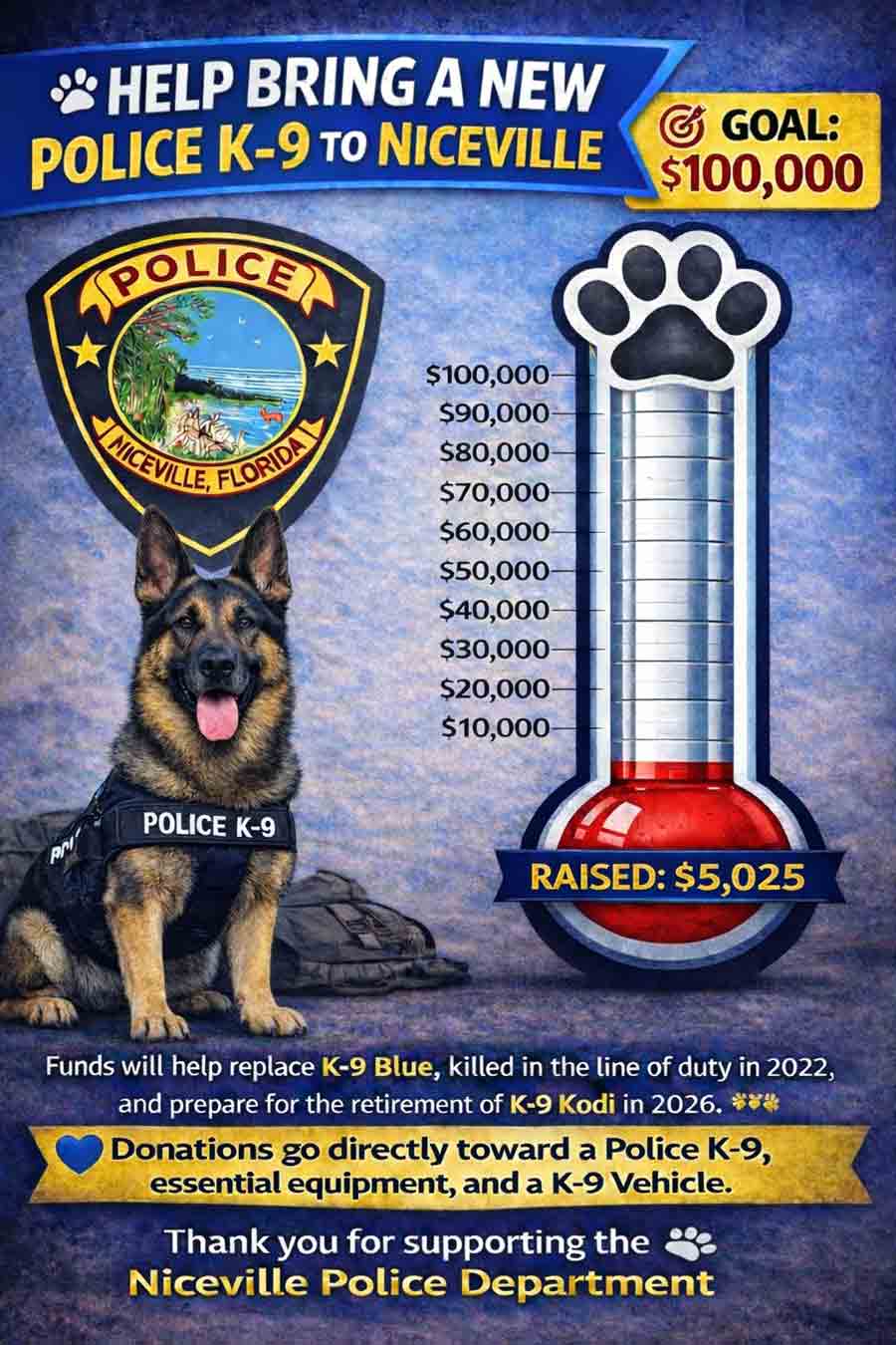 The Niceville Police Department said it is raising funds to replace K-9 Blue, who was killed in the line of duty in 2022, and to prepare for the planned retirement of K-9 Kodi in 2026.