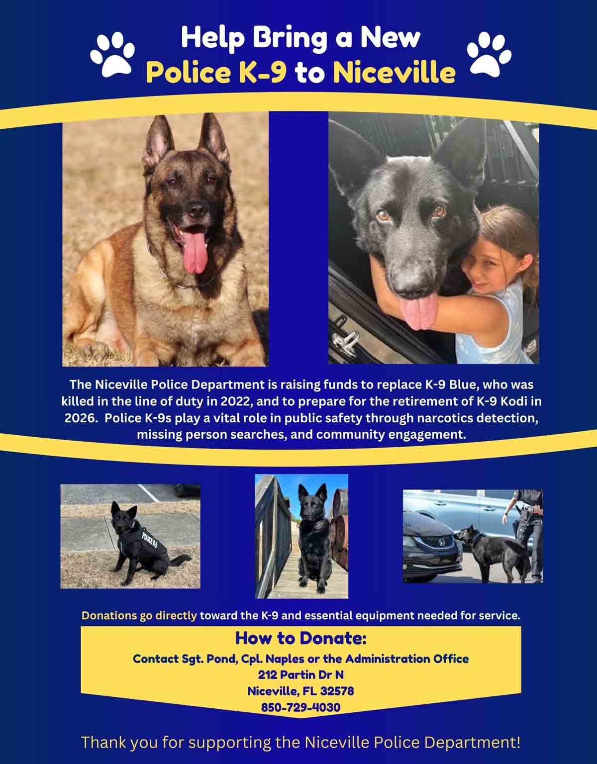 The Niceville Police Department said it is raising funds to replace K-9 Blue, who was killed in the line of duty in 2022, and to prepare for the planned retirement of K-9 Kodi in 2026.