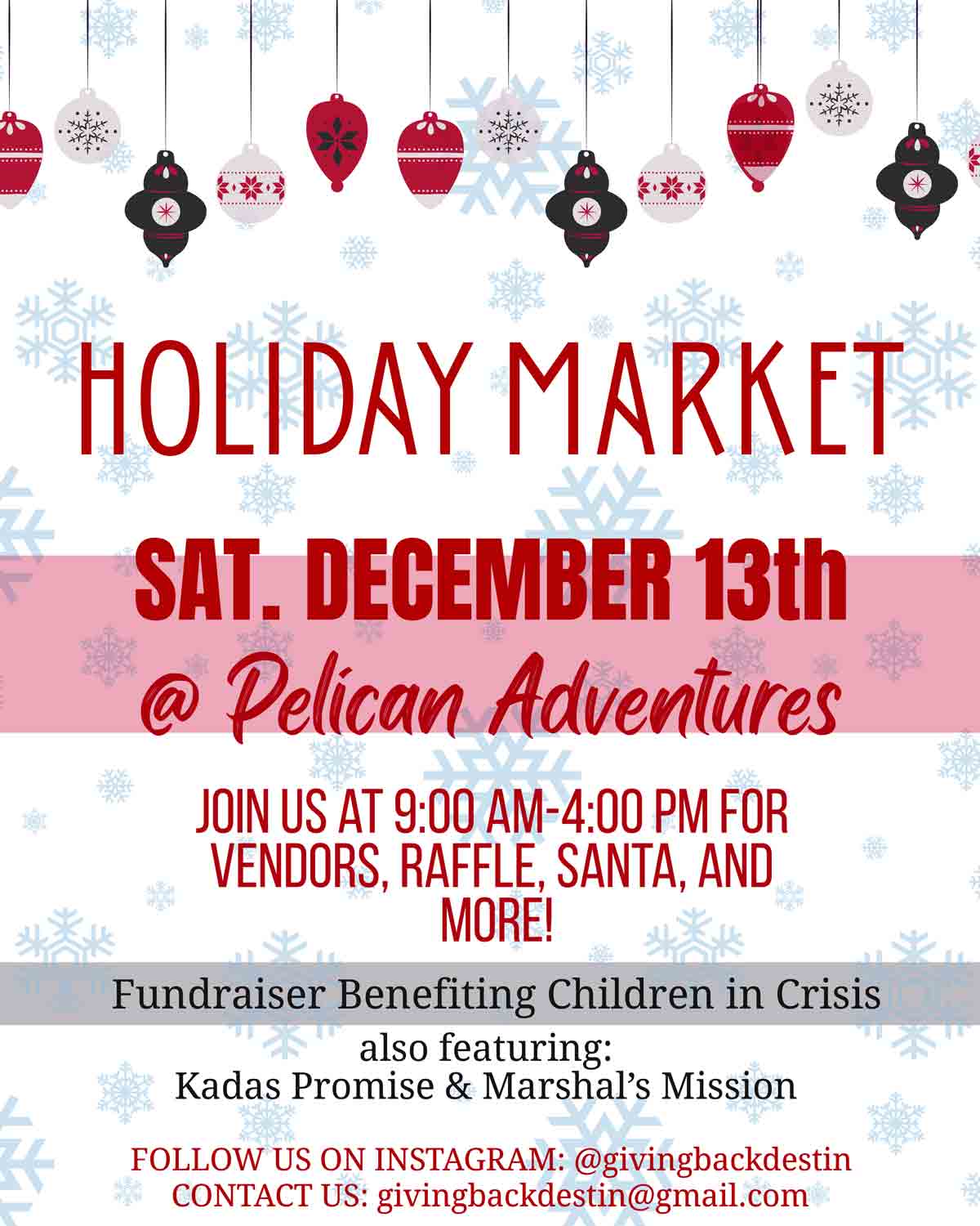A community holiday market and fundraiser will take place on Saturday, December 13, from 9 a.m. to 4 p.m. at Pelican Adventures, 580 Harbor Boulevard in Destin. The event will feature local vendors, raffles, Santa visits, and family-friendly activities.